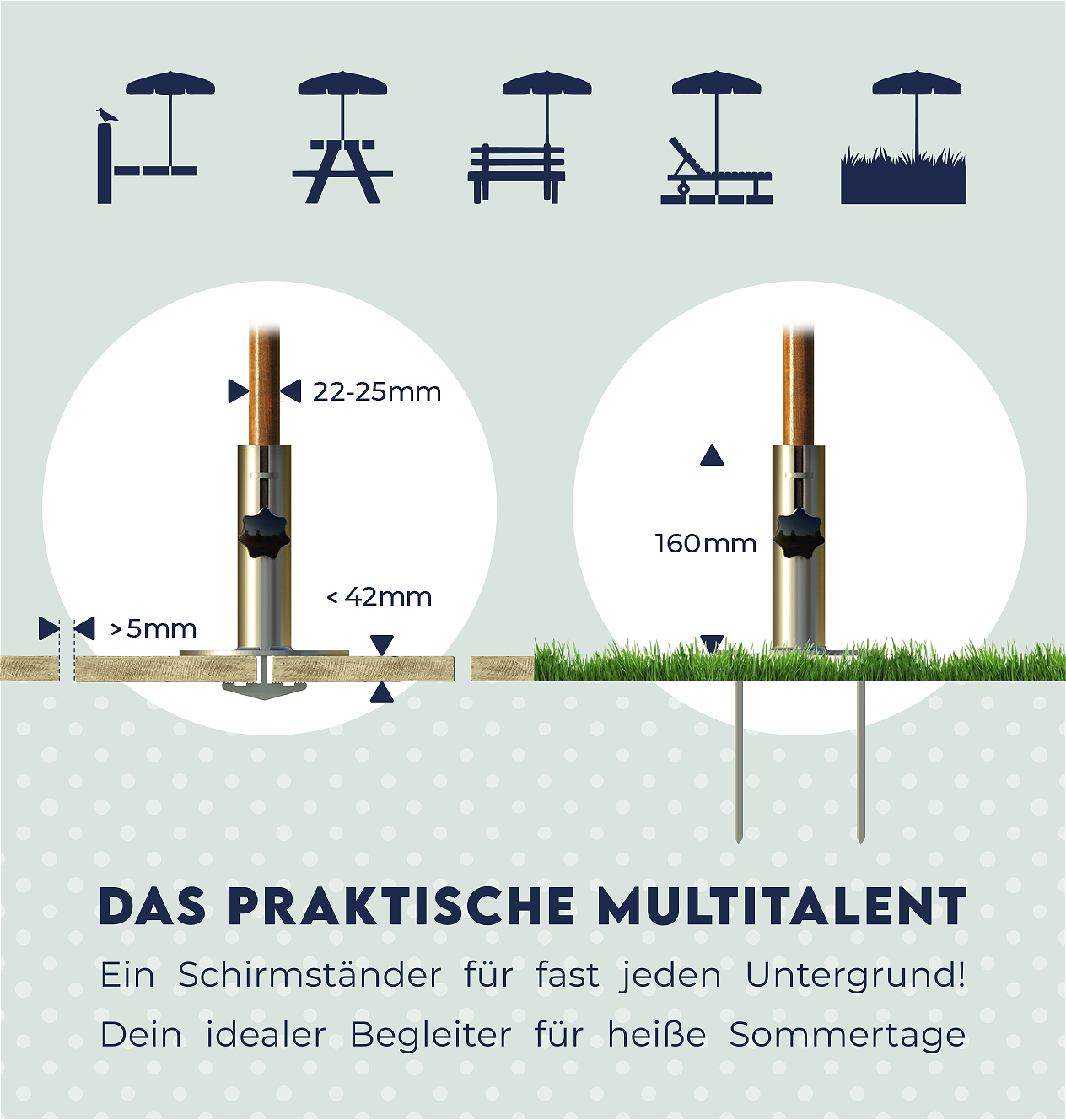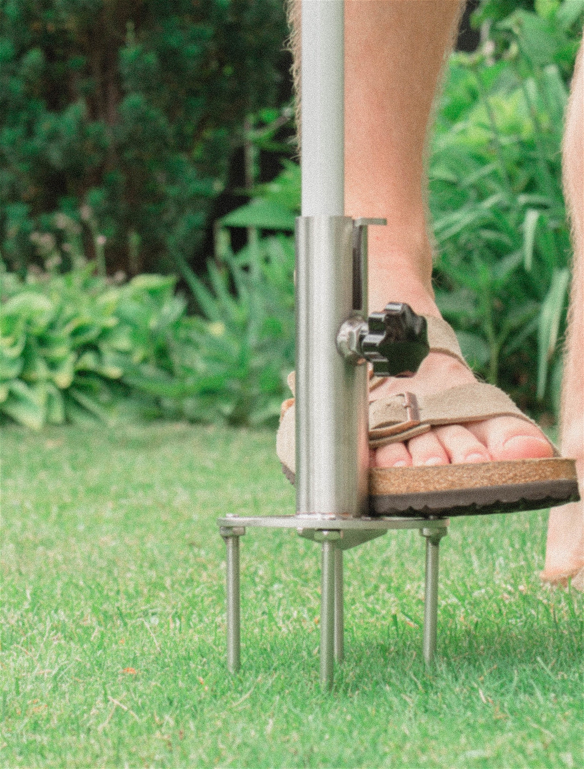 Tip: Our umbrella stand is ideal for trips due to its small design. If you want to use your umbrella stand as a fixed umbrella stand on the same place on your terrace or an outdoor table, the holes, which are actually for the lawn spikes, can also be used to screw the umbrella stand. We recommend 4x35mm stainless steel wood screws.