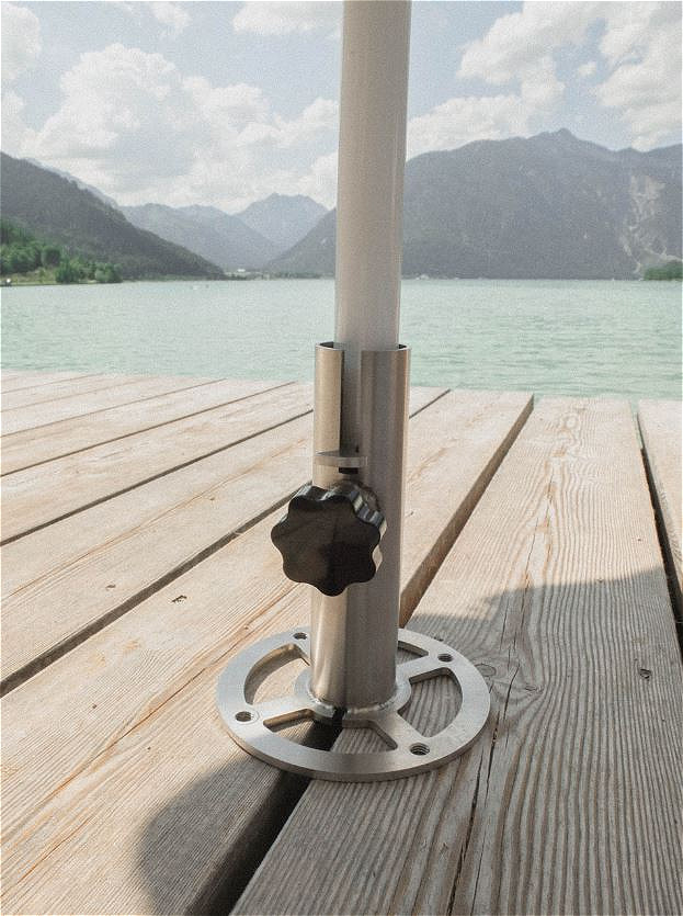 Finally! A compact and lightweight umbrella stand solution which also allows you to create a shady spot on hot dock woodenboards. Made of stainless steel, the bathing dock umbrella stand can be used on docks, sunbathing platforms, tables, park benches and of course in the meadow.