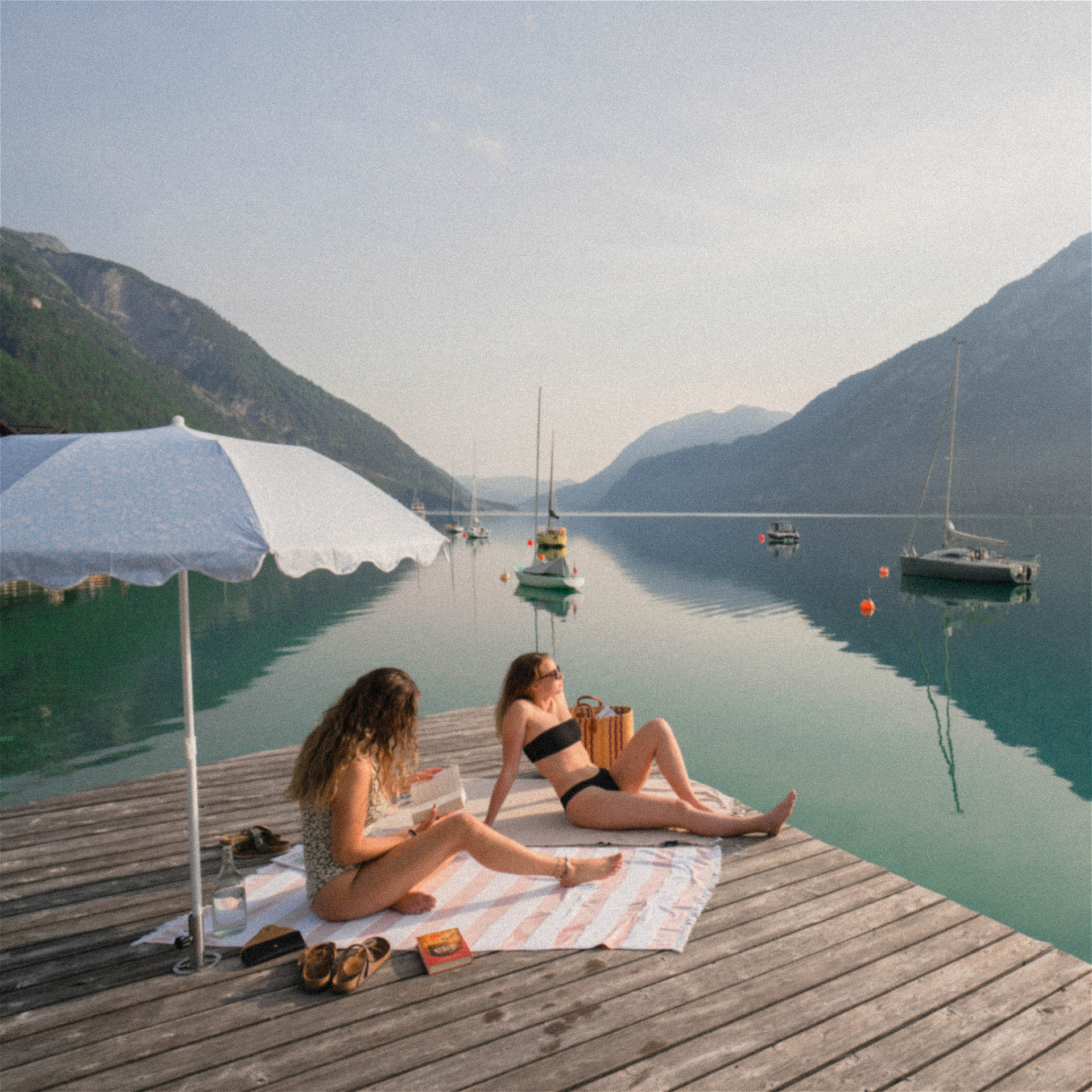 We all love beautiful ambience in the garden or on the terrace, for this a retro cotton umbrella can give a special vintage flair. Unfortunately, these heavy cotton parasols with wooden poles are very impractical to take with them to the lake, the sea or the swimming pool. However, you don't have to do without a cozy flair. The Wild flowers Pocket beach umbrella combines a beautiful retro look with a practical folding function. The folded length of the umbrella is thus only 74cm long. So the parasol can become a practical companion for your bathing day in your backpack or bathing bag. The inner aluminum coating provides maximum sun protection.